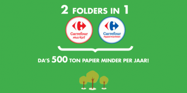 Klanten konden tot nu toe de aanbiedingen van Carrefour in twee aparte folders vinden, een voor de hypermarkten en een voor de Markets. Na een succesvolle test enkele weken geleden besliste Carrefour om haar folder in een nieuw jasje te steken: vanaf nu worden de 2 folders dus 1 enkele folder. Dankzij deze vereenvoudiging is de klant nu zeker dat hij de getoonde promoties in beide winkelformats kan vinden. En het positief effect voor het milieu mag gezien worden: 500 ton minder papier per jaar.