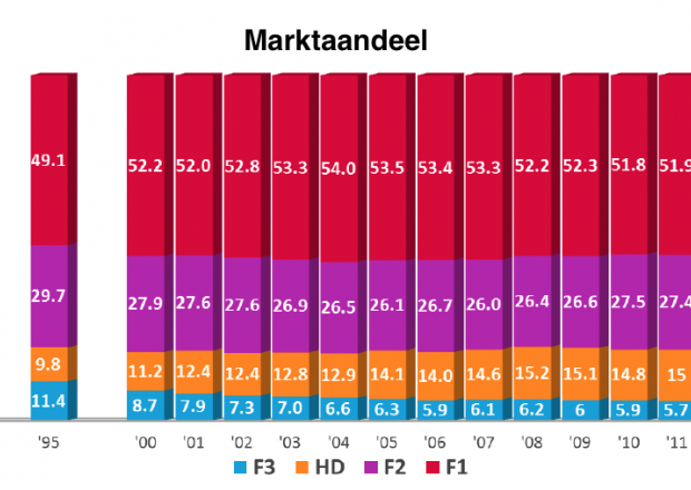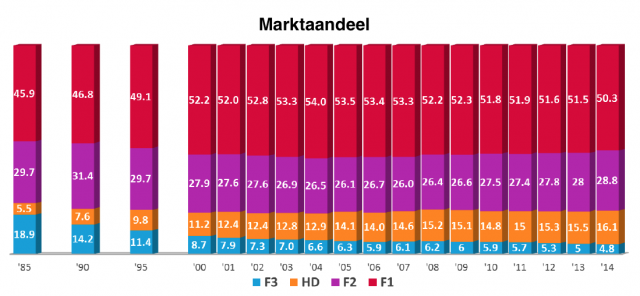 F2 heeft 28,8% marktaandeel en dit stijgt sinds 2007 HD heeft 16,1% marktaandeel en dit groeit langzaam maar onafgebroken sinds 1985 Het marktaandeel van