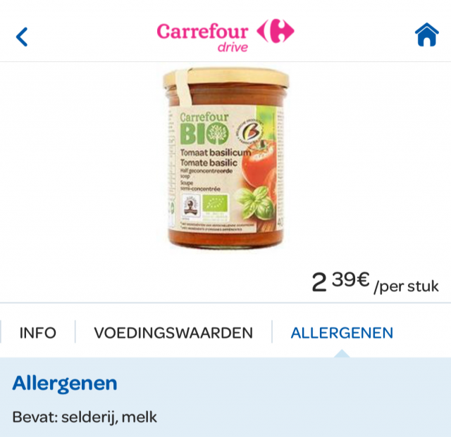 Met de Carrefour-app kunnen klanten de volledige lijst met allergenen in een product opvragen. Even de streepjescode van het artikel scannen volstaat om alle informatie over het product weer te geven op een smartphone.