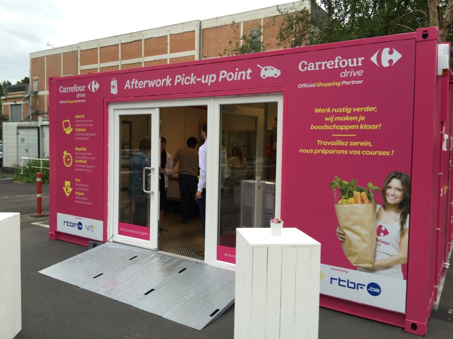 Op de parking van VRT en RTBF aan de Reyerslaan in Schaarbeek heeft Carrefour een eerste ‘privé-Drive’ geopend. De zowat 3.000 werknemers bij de openbare omroepen kunnen voortaan tot 11.00 uur online bestellingen plaatsen en die tussen 15.30 uur en 20.00 uur afhalen aan het ‘Afterwork Pick-up Point’.