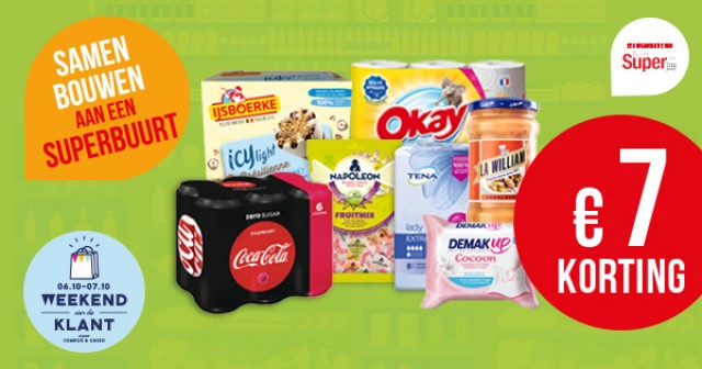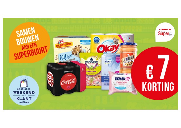 De imagocampagne ‘Samen bouwen aan een superbuurt’ is volop bezig. Tot op heden hebben we in onze communicatie hoofdzakelijk de ‘Winkelkarquiz’ en de ‘Store Locator' in de kijker gezet. Sinds deze week start onze 2e fase waarbij we de E-coupons actief gaan promoten. Er zijn bonnen van Ijsboerke, Napoleon, Demak’Up, Tena, Okay, La William & Coca-Cola. Vraag uw klanten om www.superbuurt.be te bezoeken zodat ook zij de bonnen kunnen afdrukken.