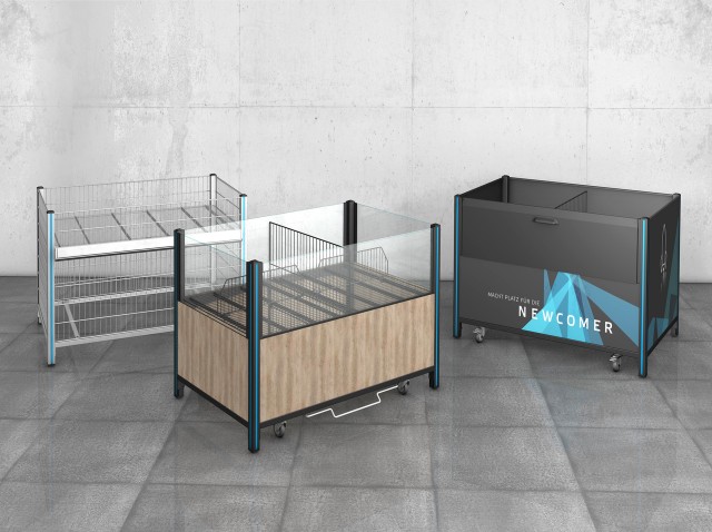 Speciaal gemaakte opzetkorven verhogen de capaciteit van de FlexTable en zijn daardoor ideaal voor cross-selling. Een een- of tweedelig bodemrooster met een hoog draagvermogen zorgt voor orde op de verkooptafel.