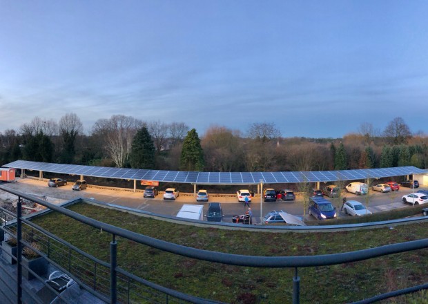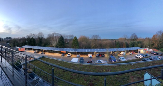 Deze ‘solar parking’ is heel zichtbaar, dus goed voor het groene imago van de supermarkt én efficiënt. Het is bovendien een extra service naar de klanten. Die kunnen hun wagens nu ook overdekt parkeren. Op de parking staan ook enkele laadpalen, die verbonden zijn met de zonnepanelen.