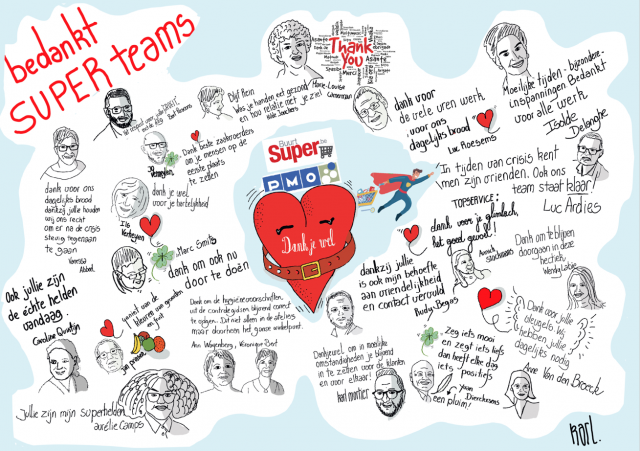 Onze PMO collega’s én trainers zorgden voor een bemoedigend gebaar in de vorm van een illustratie, gecreëerd door Karl Mortier, één van de PMO trainers. Deze illustratie steekt een hart onder de riem voor buurtsupers, supermarkten en hun personeel, die vandaag het beste van zichzelf geven.