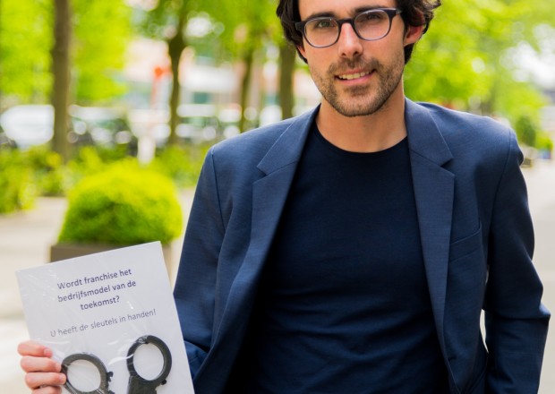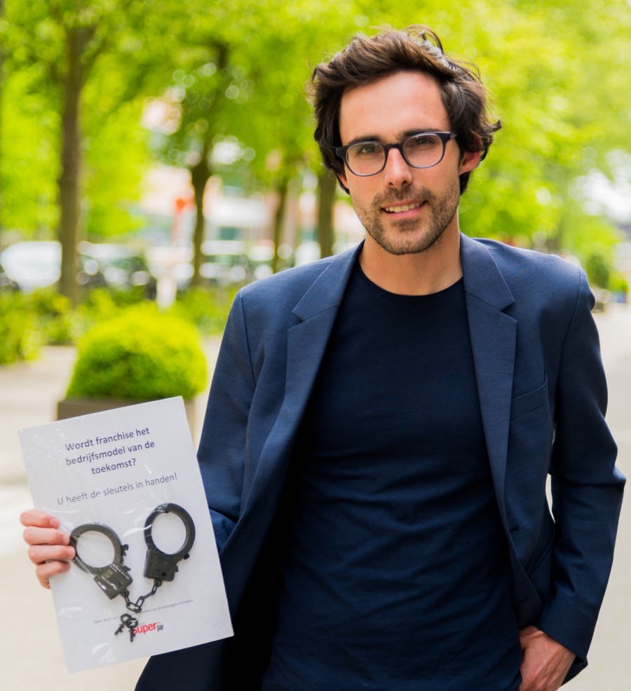 De jongste weken voerde Buurtsuper.be een actie waarbij politici (op de foto, Kristof Calvo, Groen) worden gesensibiliseerd over de kansen en bedreigingen van franchise. Onder de slogan 'Wordt franchise het bedrijfsmodel van de toekomst? U heeft de sleutels in handen!' bezorgden Buurtsuper.be-leden een pamflet met speelgoedhandboeien én sleutels aan een politicus uit hun buurt.