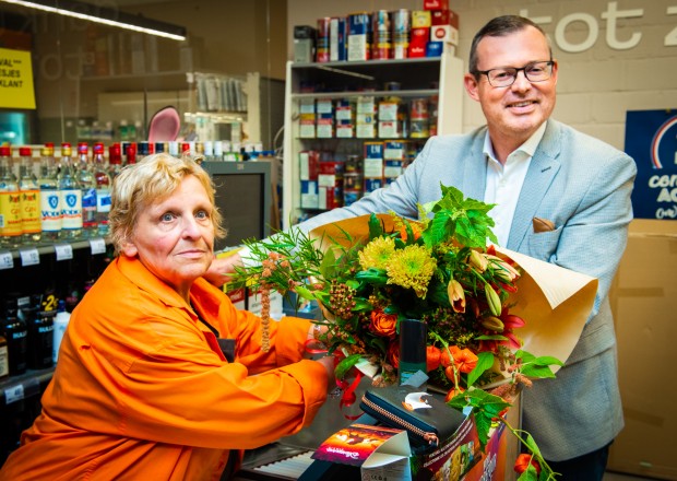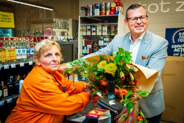 Christiane Goossens heeft zich in haar 55 jaar dienst nog geen enkele dag ziek gemeld. Luc Ardies, directeur van Buurtsuper.be, ging graag langs in de Carrefour Market in Aalst om haar, samen met de zaakvoerder en personeel, uitgebreid in de bloemetjes te zetten. Ook het Laatste Nieuws kwam langs en schreef een uitgebreid artikel over deze uitzonderlijke dame.