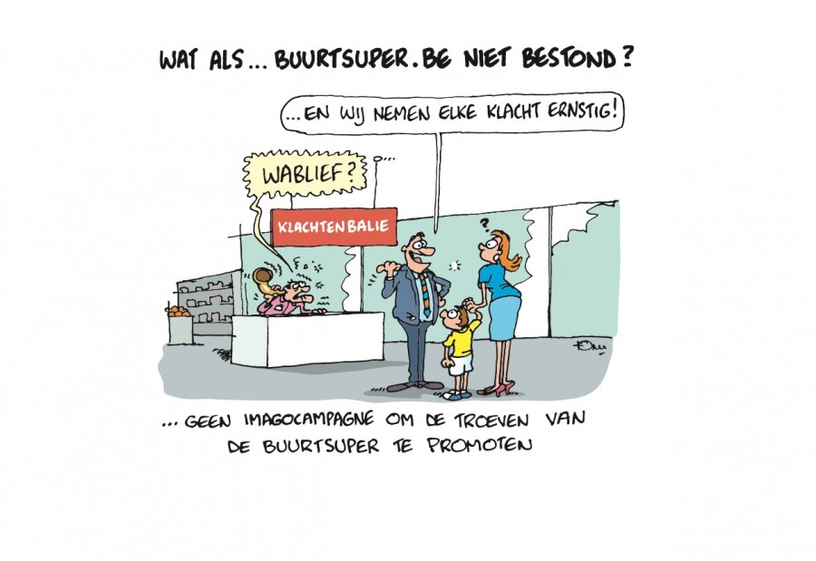 In de cartoonreeks die de toegevoegde waarde van Buurtsuper.be in de verf wil zetten, willen we deze week het belang van onze imagocampagne benadrukken.