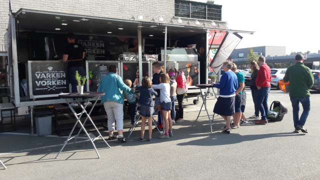 Tijdens de warme namiddag hielden de klanten na hun inkopen halt bij de foodtruck. Ook de eigenaars, de familie en het personeel zijn een bordje komen eten. De gerechtjes op het bord: varkensworst met wortel-courgettesalade, gelakt buikspek et paprikasalade en geitenkaas, en bloedworst met tomatenchutney. In totaal werden 160 tapasbordjes uitgedeeld.