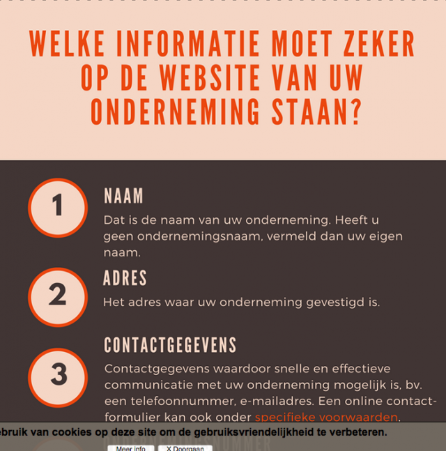 Het is ook een aanrader deze informatie aan de consument te geven via de website, zoals bv. de algemene voorwaarden en de belangrijkste kenmerken van de ondernemingsactiviteit.