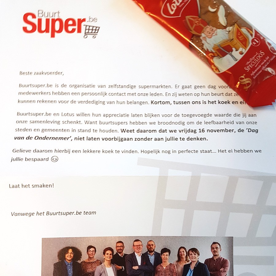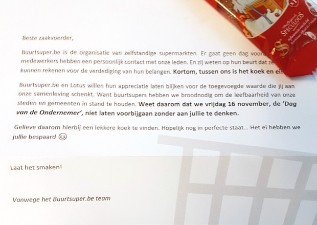Buurtsuper.be heeft afgelopen vrijdag - naar aanleiding van de ‘Dag van de Ondernemer’ - 1.000 koekjes met bijhorende bedankbrief naar zelfstandige supermarkten verstuurd. Althans, dat was de bedoeling… Jammer genoeg besliste de staking bij BPost daar voor anders over! Voor hen zal de attentie eerder als een vroeg Sinterklaas geschenkje binnenkomen. Onze excuses, maar laat het daarom niet minder smaken.